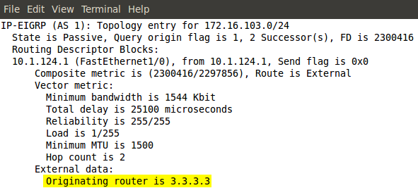 Configure R3 with the router ID = 3.3.3.3. Advertise Loopback0 (172.16.103.0/24) and Loopback1 (172.16.133.0/24) as EIGRP external prefixes.